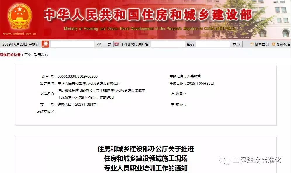 2019年6月28日住建部官網(wǎng)發(fā)布《關(guān)于推進(jìn)住房和城鄉(xiāng)建設(shè)領(lǐng)域施工現(xiàn)場專業(yè)人員職業(yè)培訓(xùn)工作的通知》(建辦人函[2019]384號)。八大員職業(yè)培訓(xùn)工作正式啟動: